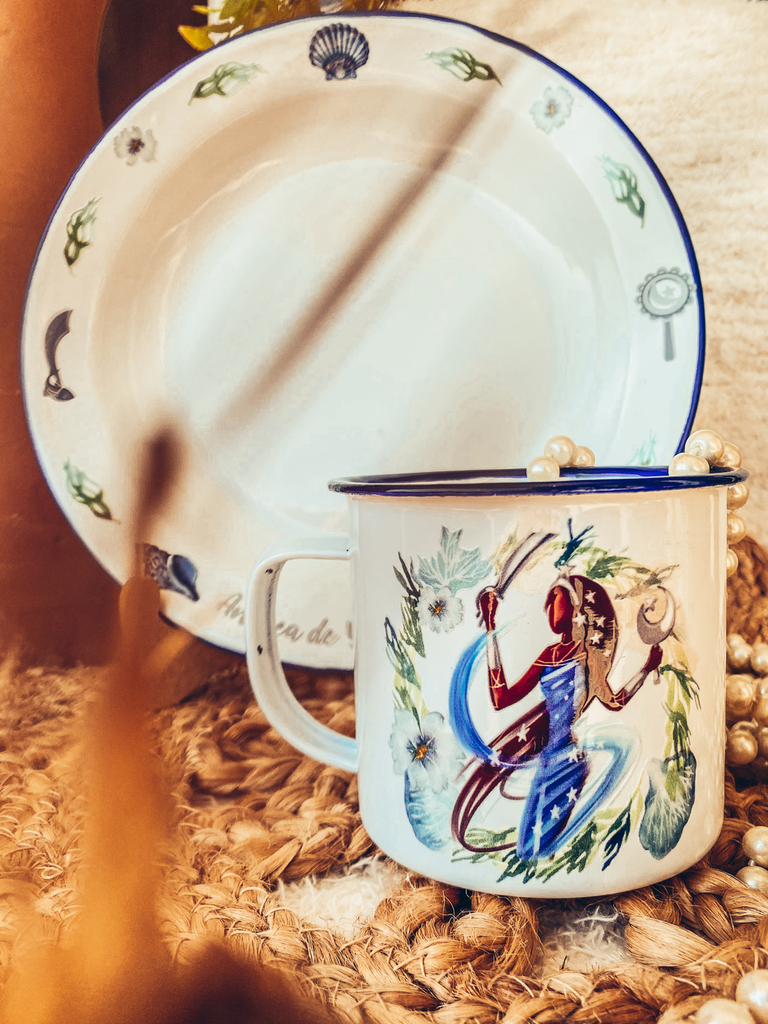 Caneca e Prato em Agata Esmaltada Com borda azul, design inovador.